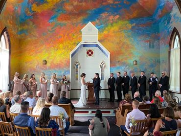 The permanent gallery sanctuary is a full sunset mural with a spacious 27ft high ceiling. The Art Church includes floor-to-ceiling windows providing beautiful natural light. Exposed beams combined with bursts of color create the perfect dramatic backdrop for your romantic event.